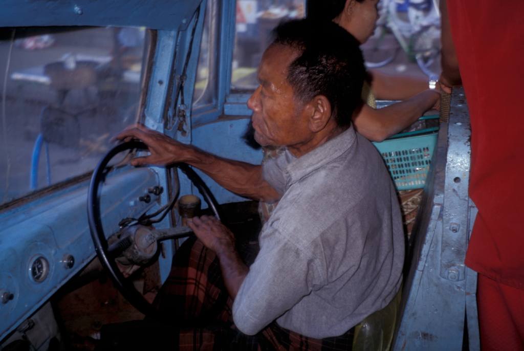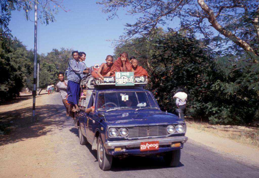 Inside pick-up truck women squeeze on small chairs, men cling to a special metal rod at the back. In the city, only monks are allowed to sit on the roof, in the countryside male passengers can also join them.