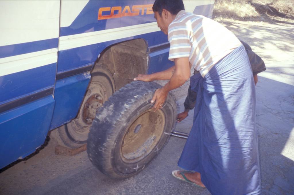 The roads in Myanmar are only wide enough for one bus, so whenever we meet an oncoming vehicle, we have to slow down and move to the edge of the road, almost coming to a stop.