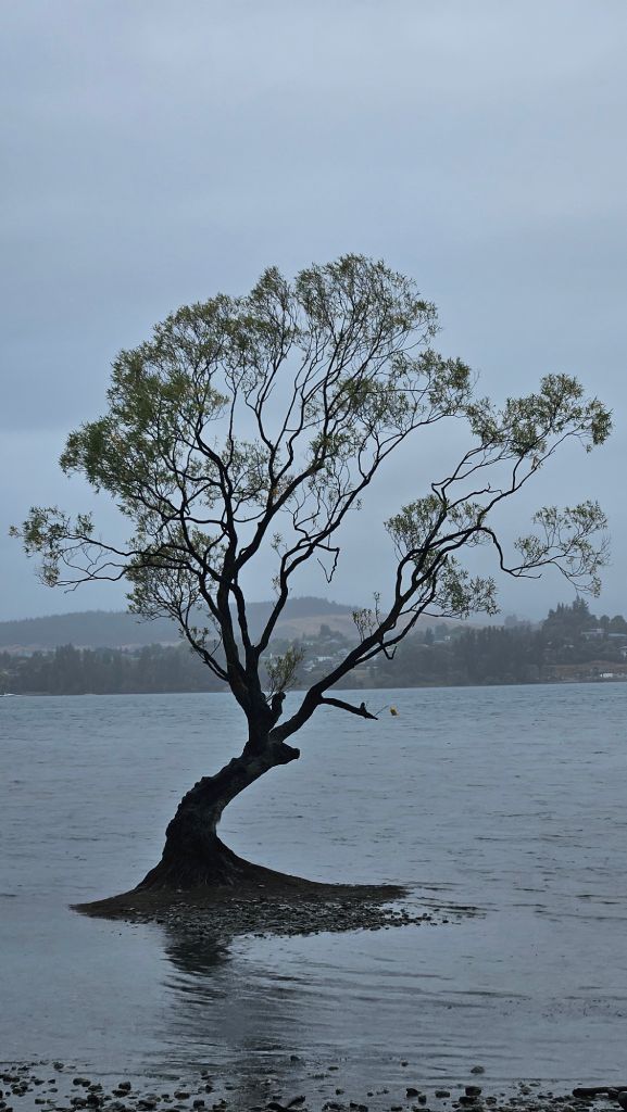 I crossed the Haast Pass and Blue Pools right during the heaviest afternoon downpour, so I didn’t stop at all. The only exception was a solitary Wānaka Willow Tree, standing a few meters in the waters of Lake Wanaka.