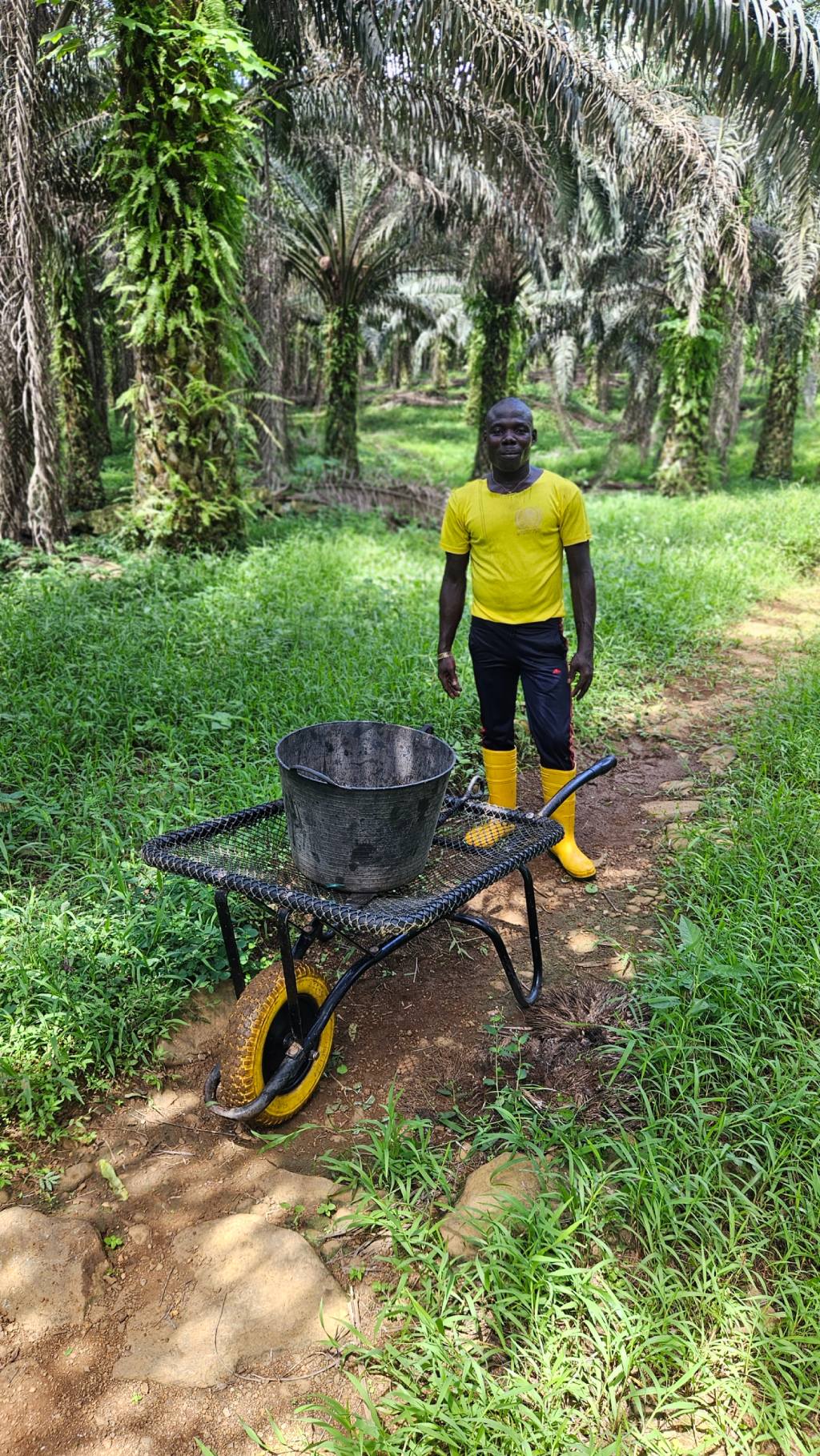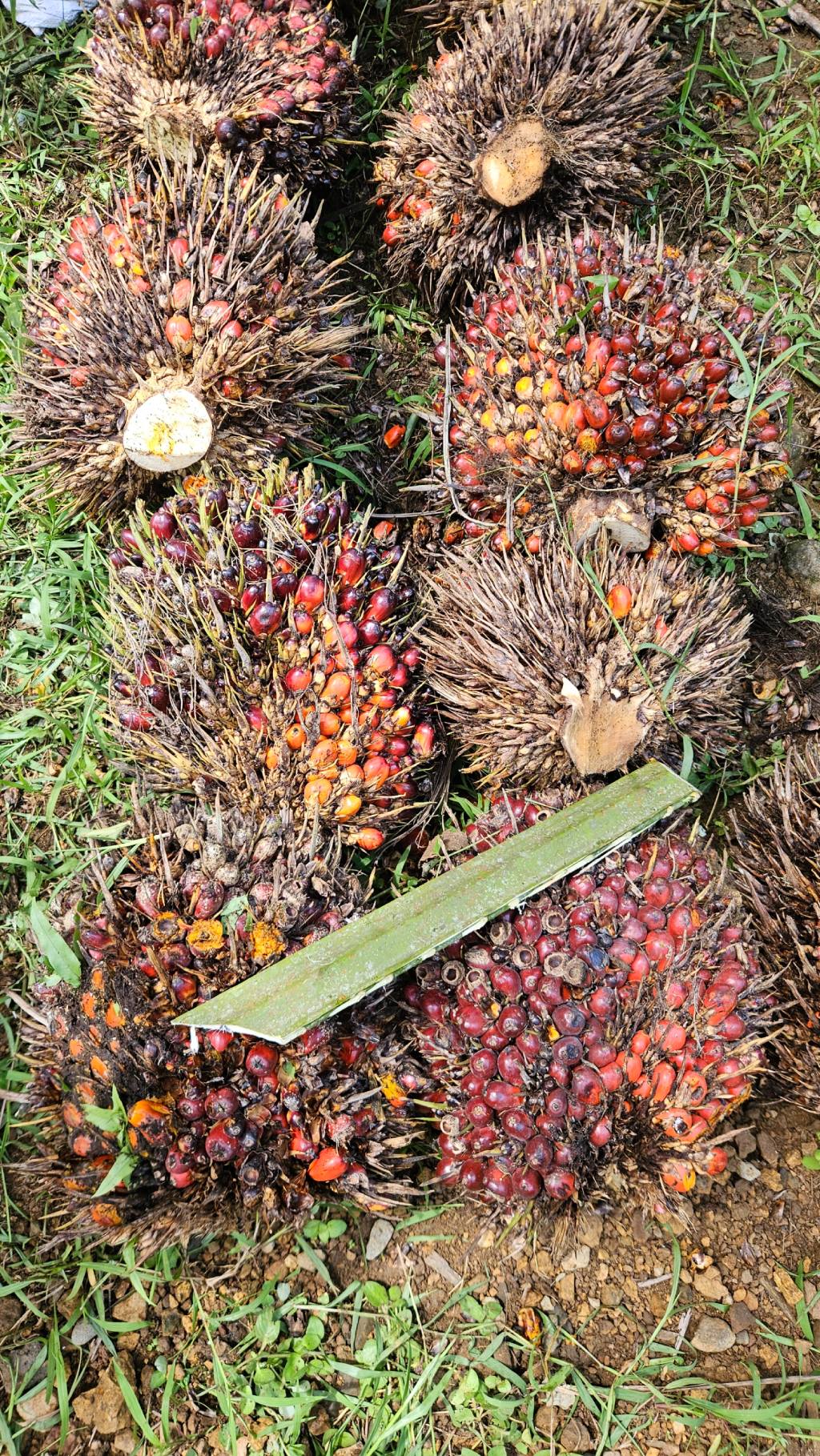 Men cut the palm fruits from the branches with an extended knife on a long stick, while women pick up individual fruits from the ground. They only work from 7:00am to 10:00am, until they reach the daily target, 6 days per week. Maybe the idea is to give more people work or to avoid the heat that during the day becomes unbearable. Men are supposed to cut 70 palm berry bunches, while women are targeting to fill up four 50-kilos plastic bags.