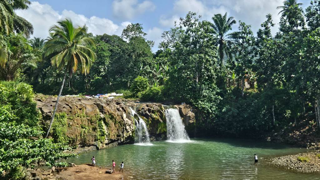 After agreeing on the commercial part, I fill the tank and kick off towards the northern part of the island. The road is newly asphalted, I meet only seldom vehicles. Young men with machetes walk along the road on their way back home from work on cocoa plantations. Bananas, papayas, passion fruit and breadfruit trees fill all areas; tall palms or tropical forest do not abound.