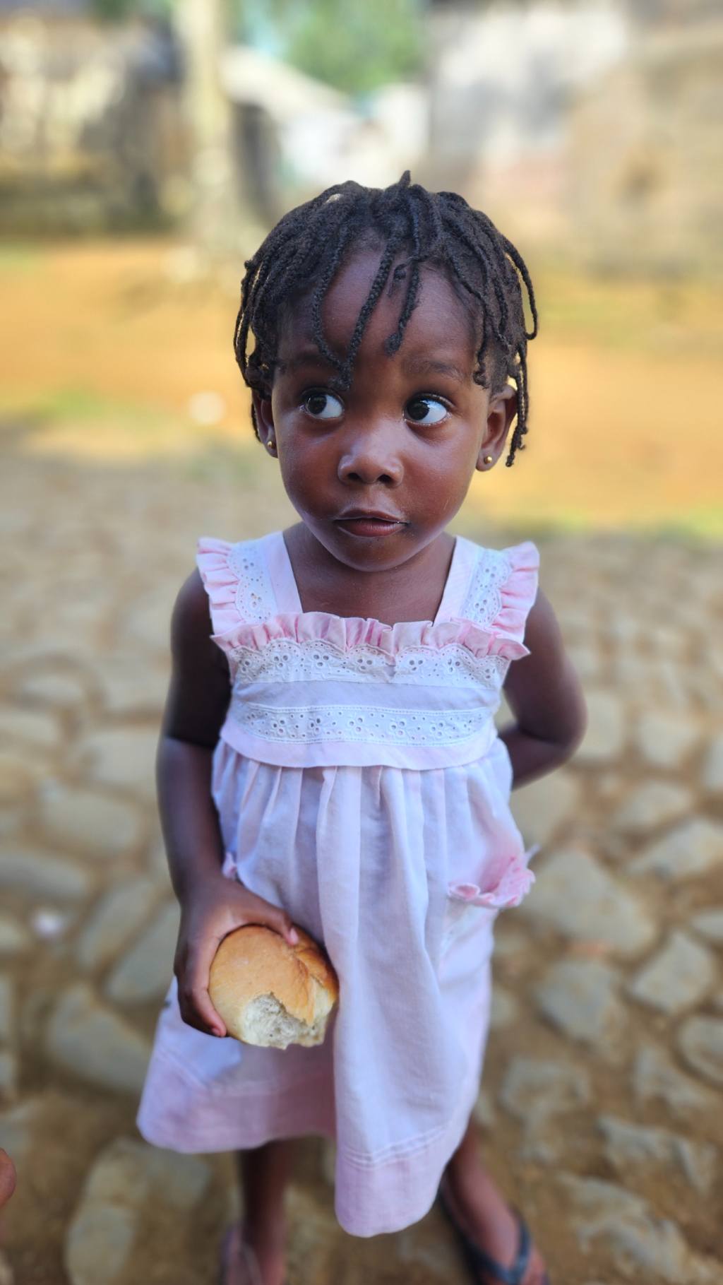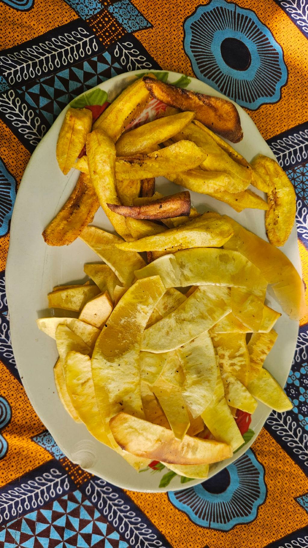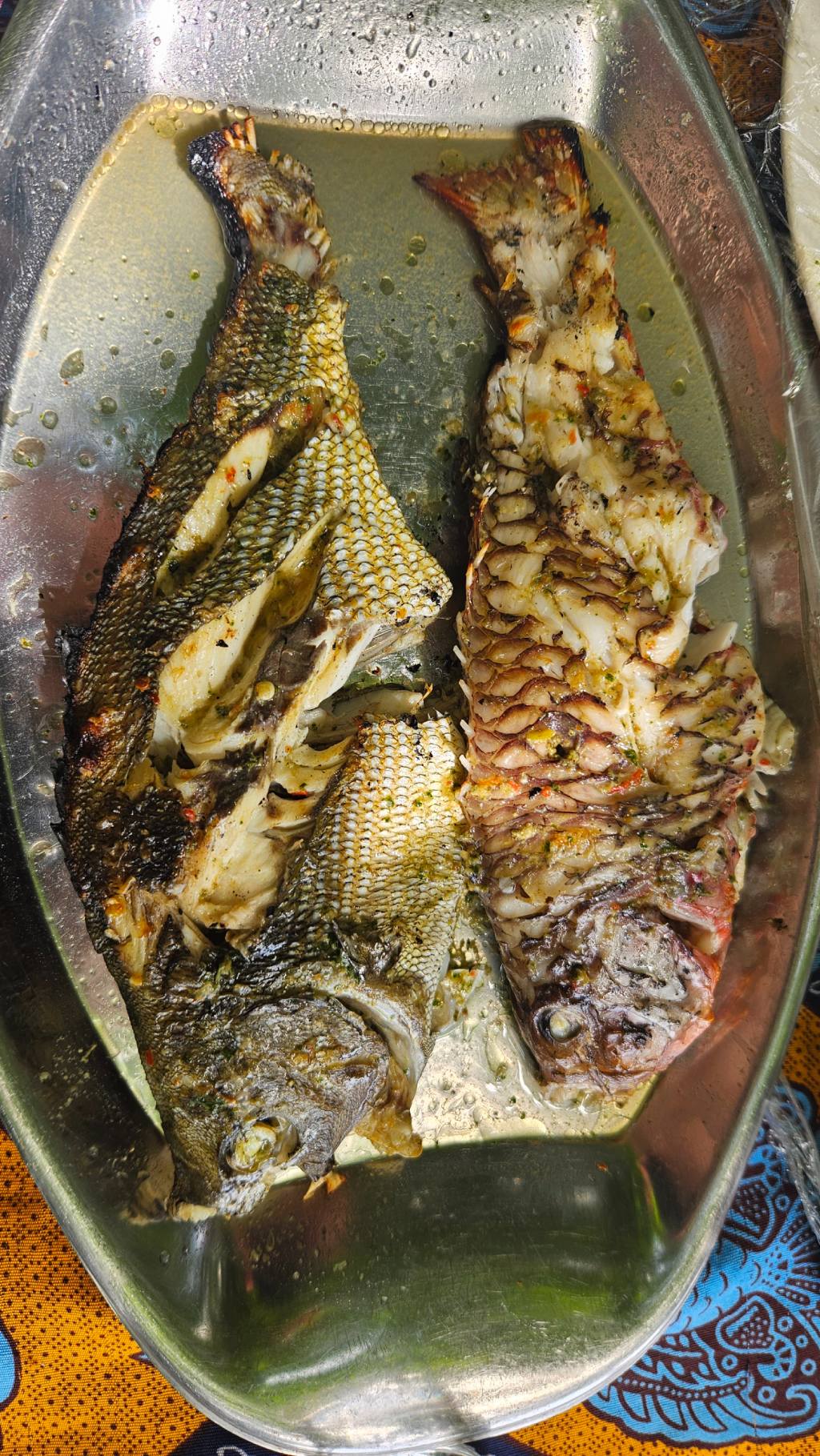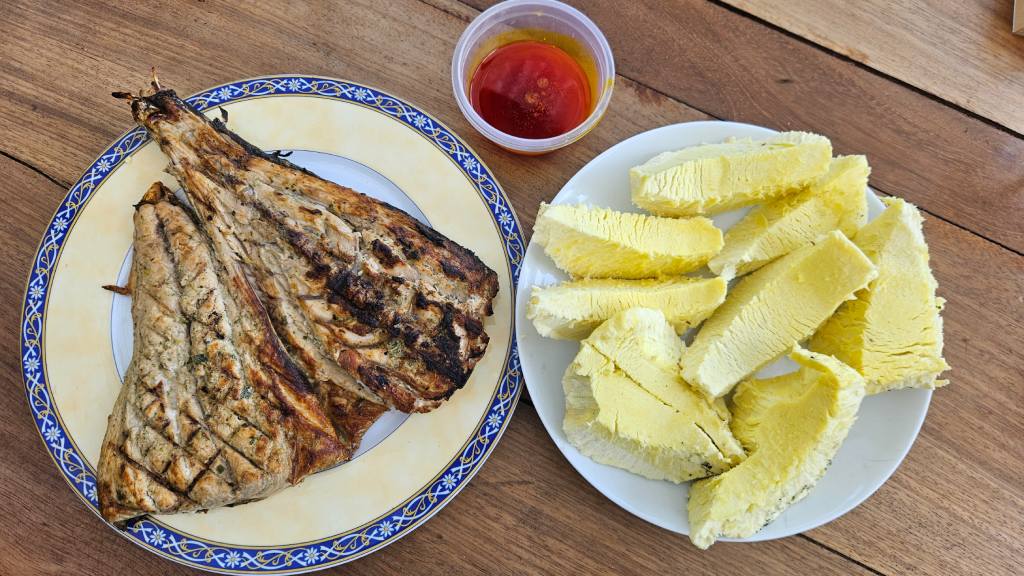 With the administrator of my cottage, Lania, I agree to buy a medium size fish, which is later prepared on a wood fired BBQ in front of her house. Her brother picks up a breadfruit from the tree and puts it on a fire until it turns completely black outside. I am not convinced that it will be eatable at all. Later, it is peeled and served as a delicious side dish to the fish, flavored with red palm oil sauce. There is too much fish for me. I invite Lania and her friends to share it with me.