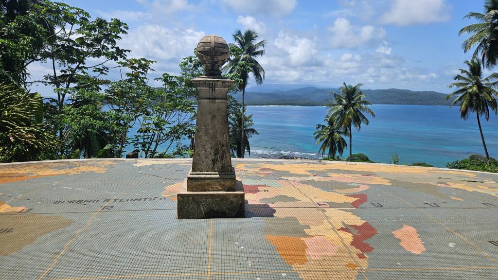 The Equator line is not as strongly marked with a monument as in Ecuador, but it is nevertheless interesting, modest, in the local style. A map of the world is dividing northern and southern hemisphere by a small statue and the equatorial line. The background of clear blue sea in the distance is unique.