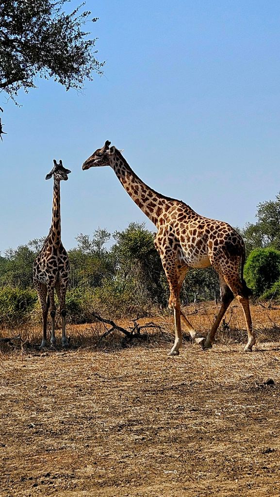 Our first encounter with giraffes came as a surprise when two tall ones suddenly appeared from behind a bush. From previous experiences in Kenya, I was used to seeing shy giraffes that would quickly move away at the sight of a vehicle. Here, they seemed much more relaxed and used to people. They only stepped behind the higher branches if we came too close.