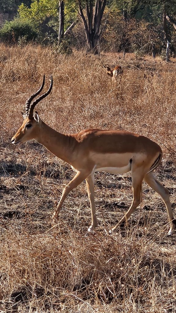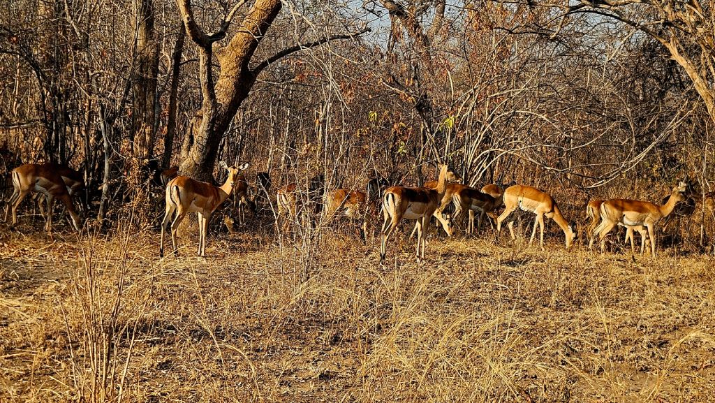 In the morning, we encountered many animals gathered in groups. Herd of up to 20 elephants were common throughout the day, slowly moving while eating, defecating, and protecting their young. Large herds of impalas were always alert and timid. They scattered quickly as our vehicle approached. I spotted buffalos in the distance, but I couldn’t get close to them along the marked trails and eventually lost them from my sight.