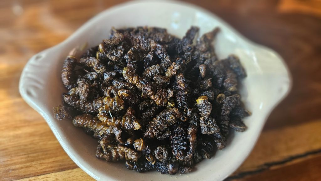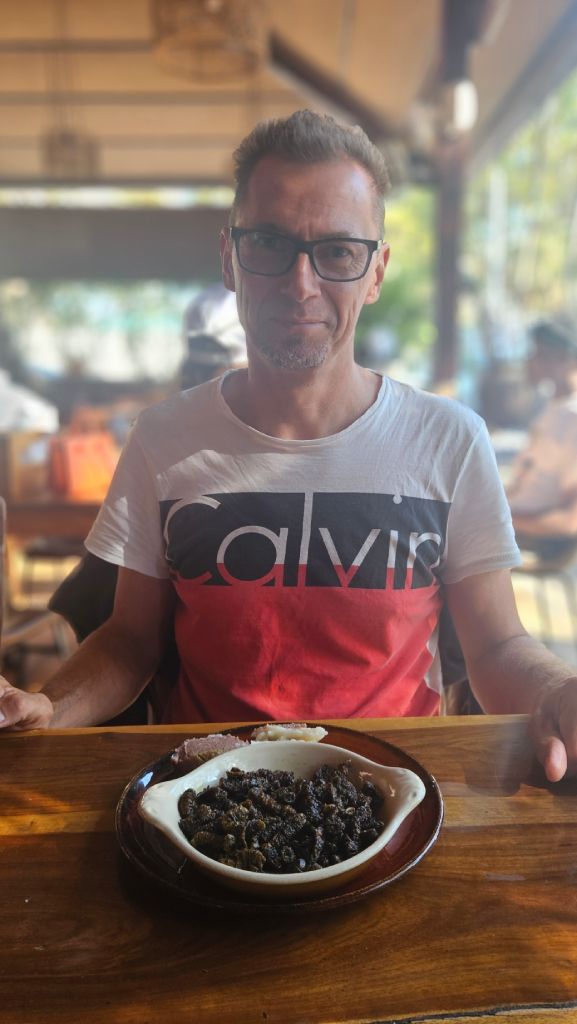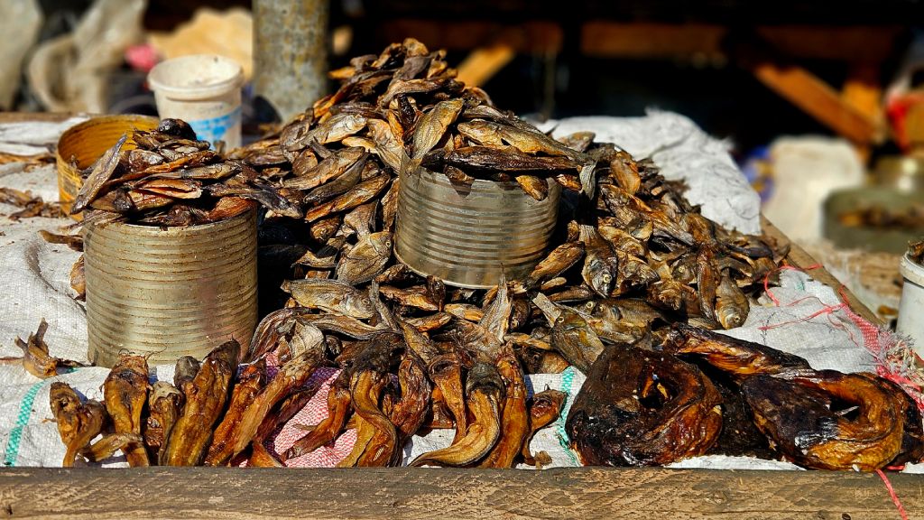 Along with fish, I decided to try a local specialty – Mopane worms – Ifinkubala. For my taste, the roasted caterpillars of the emperor moth were a bit overcooked and quite tough. They are a highly nutritious, protein-rich delicacy, usually boiled and then fried with tomatoes and onions. Mopane worms are served with nshima or eaten as a snack in Zambia, Zimbabwe, Botswana and South Africa.