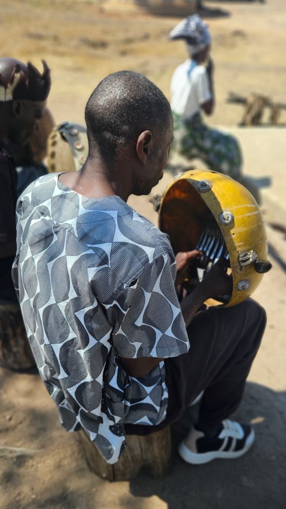 What called my attention were the particular instruments. The mbira is a thumb piano, made from strips of metal mounted on a wooden board and placed within a resonator. A group of men played by plucking the keys with the thumbs and fingers. They were holding mbiras inside a large calabash resonator to amplify the sound.