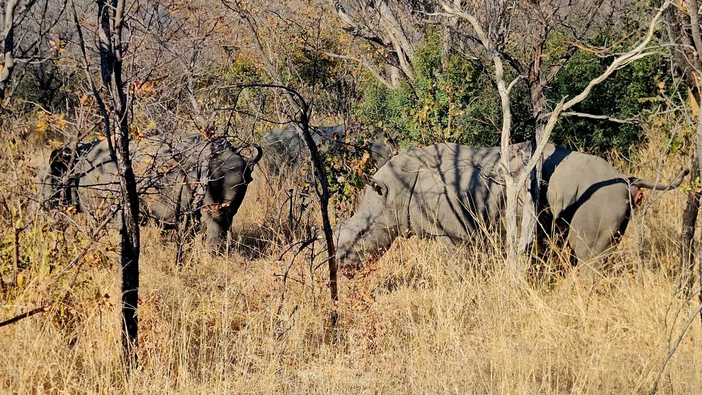 Not far away, we spotted a family of five rhinos grazing in the late morning. They moved slowly, calmly eating leaves approximately 7 meters from us.