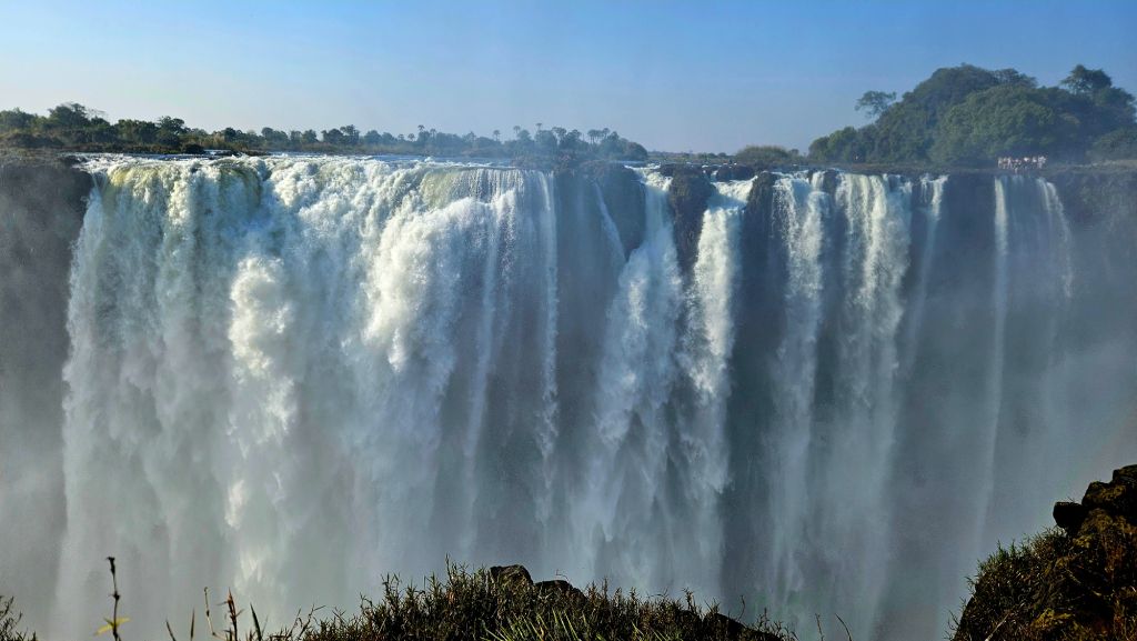 Even in the dry season, there was still plenty of water. On this side of the falls, I noticed far more foreign tourists than in Zambia. Helicopters carrying visitors circled overhead, offering panoramic flights above the thundering curtain of water.